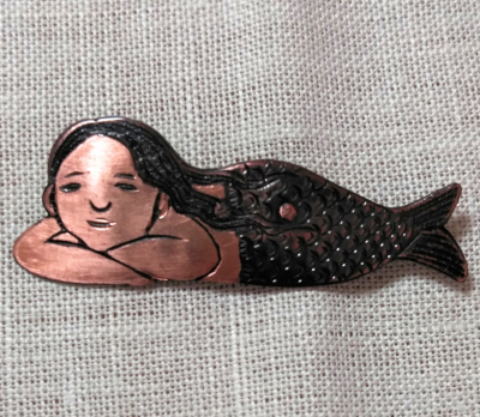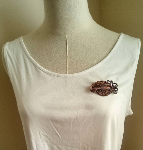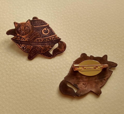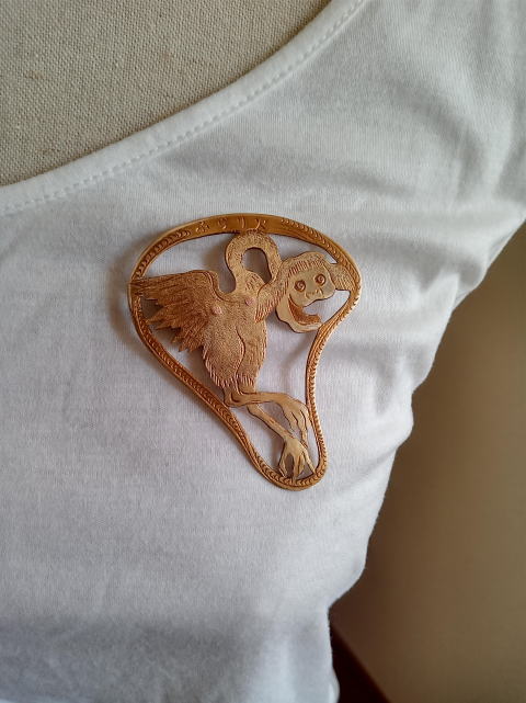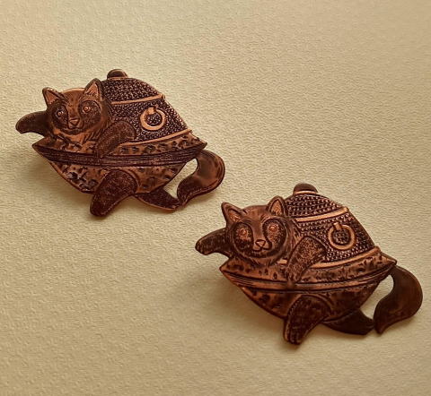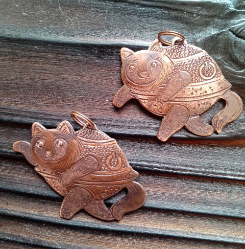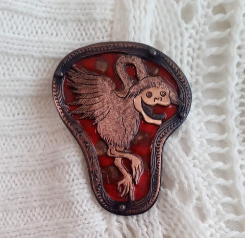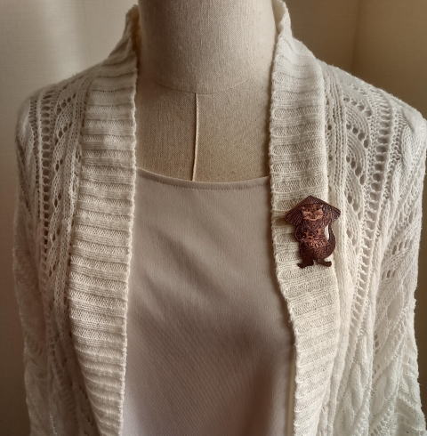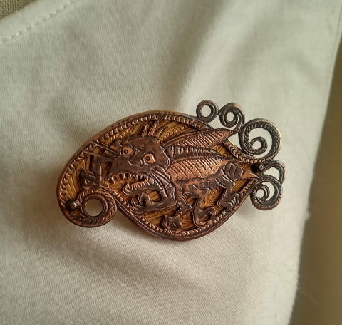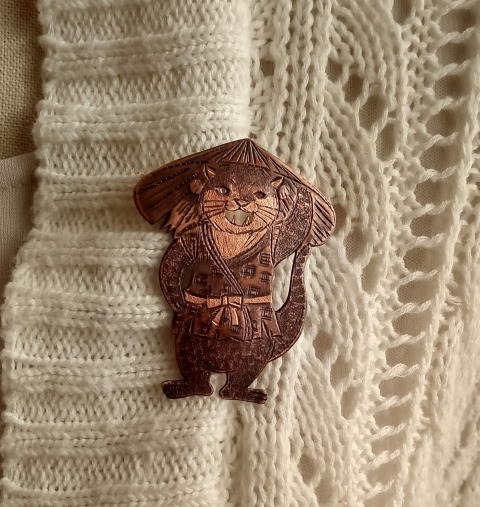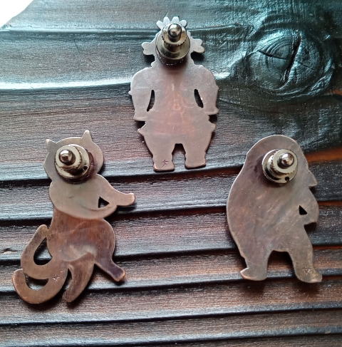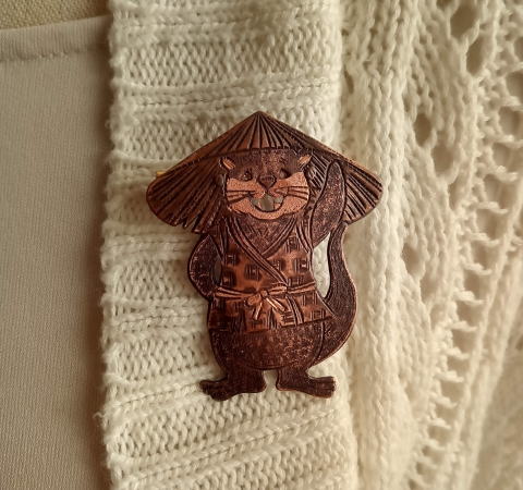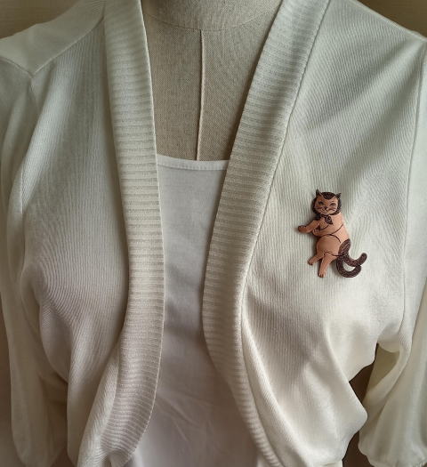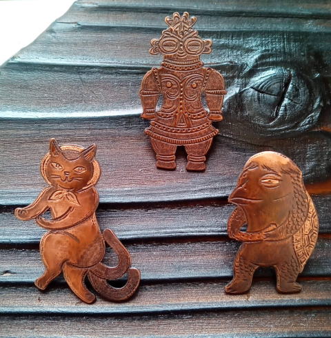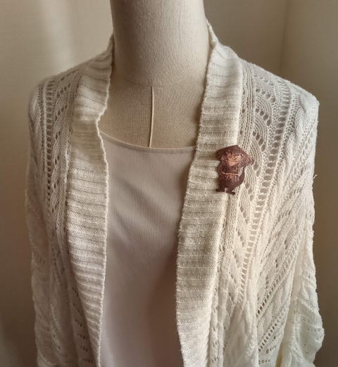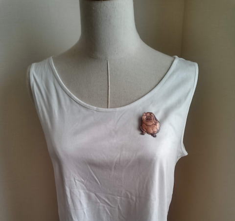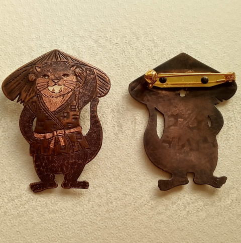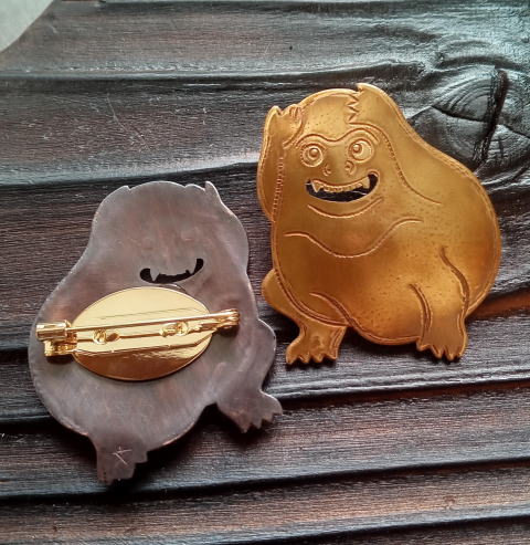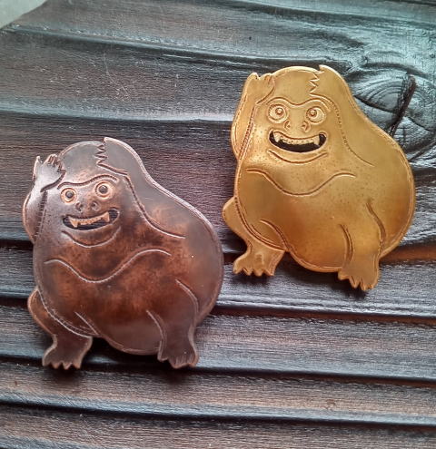銅 真鍮 各 ¥2300 9g 横3.8cm謎肥満生物の丸いフォルム 付けてみたらけっこうかわいいです このぬるっとした丸みの腹肉の表面に何もつけたくなかったのでブローチ金具はカシメて本体に穴をあけるタイプではなく 強力な接着剤で付けるタイプにしました この妖怪 見た目とは裏腹にとてつもなく恐ろしい妖怪でした ~恥ずかしい感情が凝り固まって産まれる中国の妖怪 謝豹虫 がモデル人なっており 辱めを受けて死んだ物が化けたとされる。普段は人目を忍んで土の中に隠れているが もし運悪く掘り当ててしまったとしたらその人は恥をかかされた恨みによる祟りで、 とんでもなく恥ずかしい目に合わされるという~ だそうです なんという理不尽!!うっかりガーデニングもできません
