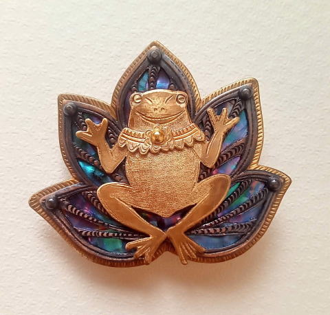 ![]() カリスマカエルブローチ ¥6600 銅 真鍮 螺鈿 螺鈿煌めく蛙のブローチです ただ物ではない風格 彼は田んぼの蛙の合唱のリードボーカルを務めていらっしゃいます
