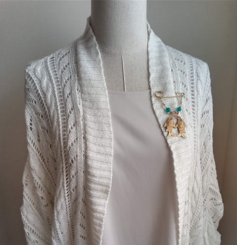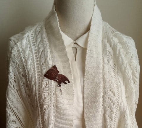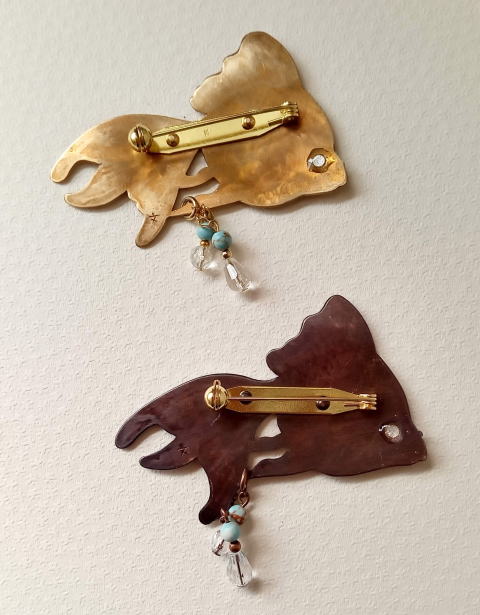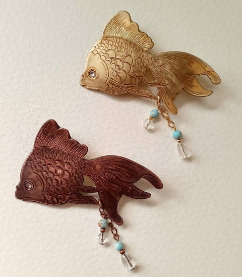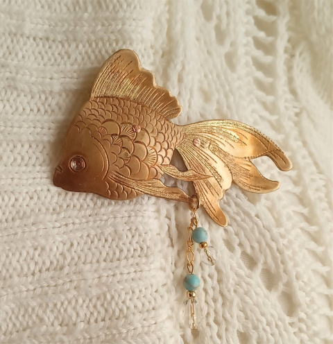 ![]() ![]() 琉金ブローチ 各¥3800 銅製 水晶 ターコイズ使用 真鍮製 水晶 ターコイズ使用 涼やかな琉金のブローチです ぶら下がっている石はフンではなく煌めく水泡を現しております