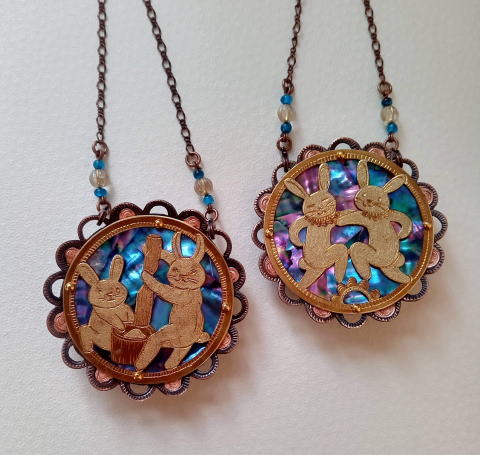 ペアで軽快に踊るうざきと、餅をつく筋肉質な兎と素朴顔な兎 のニ種類です 元気・躍動月の兎 各¥8800 真鍮 銅 螺鈿 |