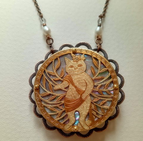 顔をうずめたくなる猫のお腹! お腹に重きをおきました 魚のうろこは 白と青の螺鈿を挟んであります 俺の魚シリーズは10年以上前から時々作っている 魚とそれに飛びつく猫 であります