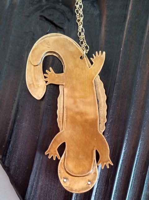 ![]() ![]() kaeru-10 煌きカエル王子ネックレス ¥5200 縦 5cm 17g チェーン45+5cm 銅 真鍮 螺鈿 生まれし時より崇め奉られ 裏は幼少期です |