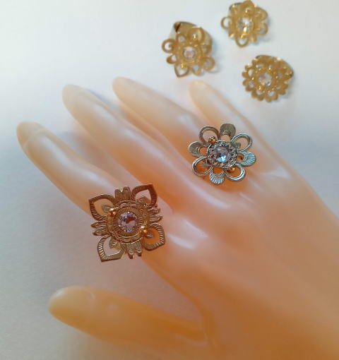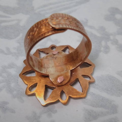 モチーフ付きの指輪は初挑戦でしたが 我ながら なんとゴージャス!!・・とちょっと驚きの出来です 指輪本体 花弁モチーフ 螺鈿 スワロフスキー 中央パーツ をカシメで合体させました 設計図段階では 無理かも ・・と思いましたが 少々の屍作品はこさえましたが できました!
