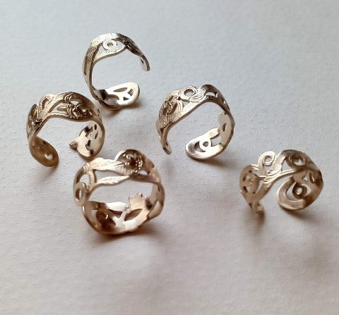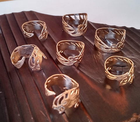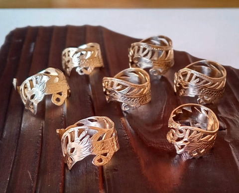 カシメでできるもんだなあ・・と我ながらびっくり 二点作りまして 1点はご注文のお客様用もう一点は 奈良町のギャラリー 空歩さんに 納品しましたが即日お買い上げ頂きまして ひたすらに感謝です!また違うデザインで指輪に挑戦したいと思います |