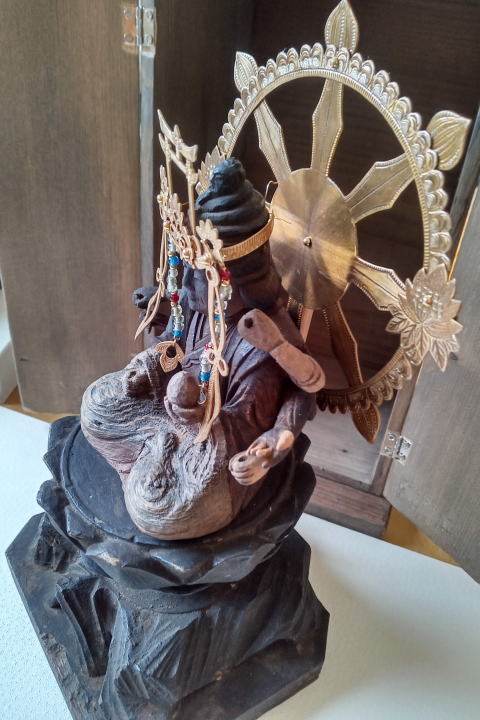| 母性溢れる弁才天様を荘厳しました 古い仏像でしたので取り付け時に破損しないかドキドキハラハラでした 光背 宝冠 持仏のセットです 真鍮板 真鍮棒で作りました 宝冠の鳥居の向こうから宇賀神さまが丁度見えるのが実によし!自画自賛 |